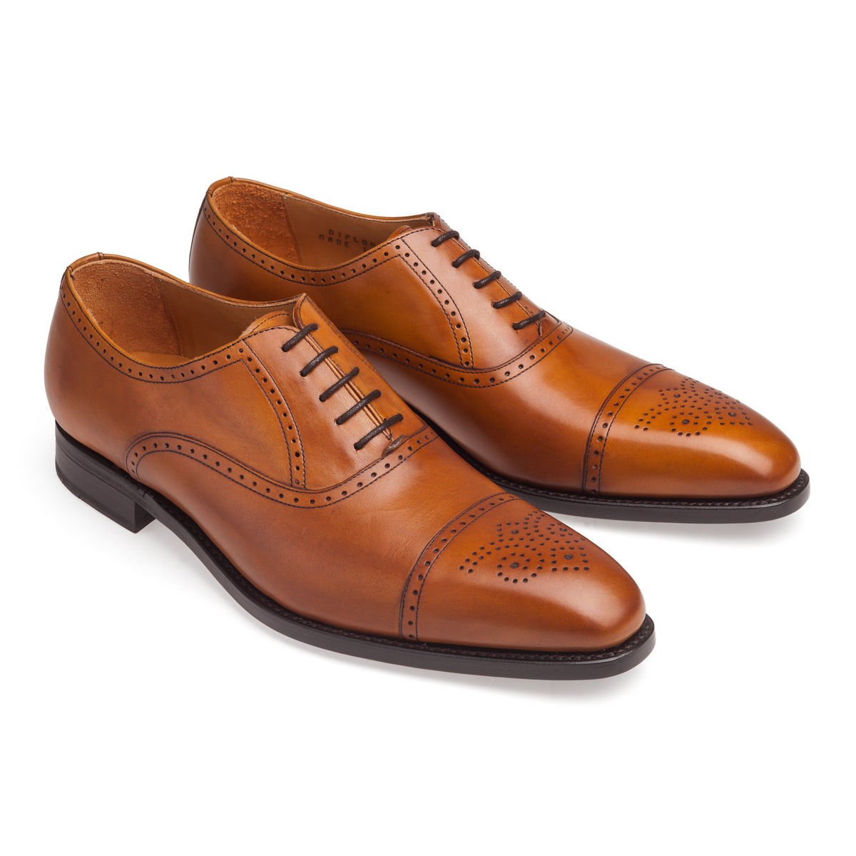 Finsbury Diplomat Tan — это элегантные оксфорды-аделаиды (adelaide oxfords), то есть оксфорды без боковых швов. Кроме того, эти туфли являются брогами — или, если быть совсем точным, полуброгами (half brogues). Декоративные дырочки на них размещены вдоль всех швов, а также на мыске — в виде своеобразного узора, называемого медальоном.
